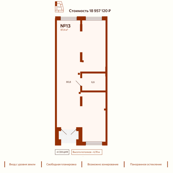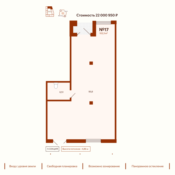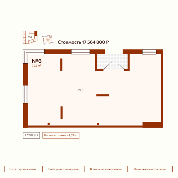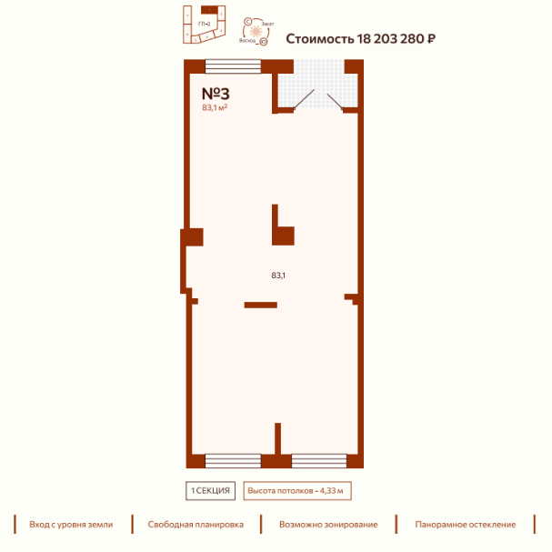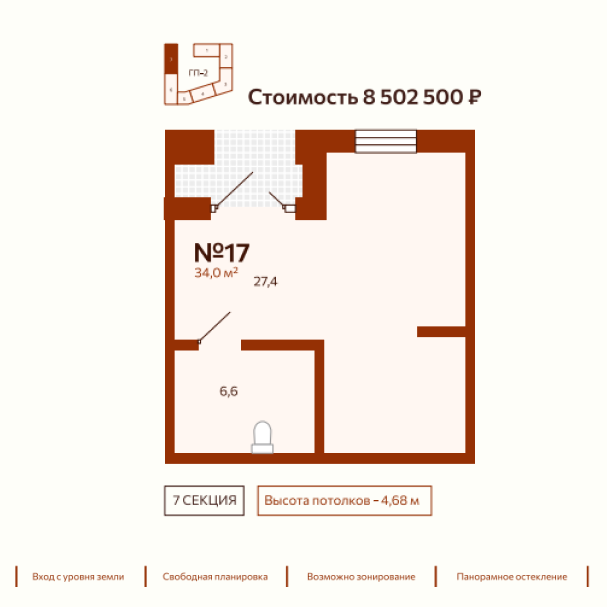 Представлены «хайфлеты» — квартиры со вторым уровнем, отличаются высотой потолков и большими панорамными окнами.